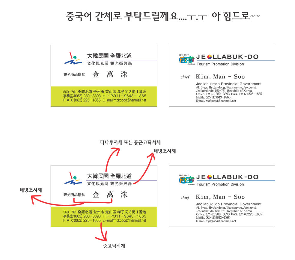 중국어 간체로 명함글씨 아웃라인 부탁드려요...ㅜ.ㅜ 혀리 일반 0 6955 2007.02.06 19:47 -0001.11.30 00:00 jj.ai (0byte) + 34 아무리 방법을 모색해도 할수가 없네요... 오늘 인쇄해야하는데..ㅜ.ㅜ 염치불구하고 올려봅니다...부탁드릴께요...ㅜ.ㅜ