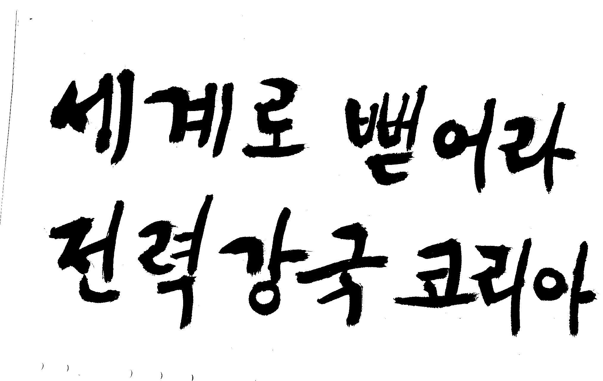 캘리 좀 부탁드려요!~ 김철호 일반 1 12217 2008.12.24 12:08 > > 전력회사 신문광고를 하는데요 캘리로 멋지게 하고픈데 > 캘리프로그램으로 아무리 써도 느낌이 안나옵니다 ㅜ.ㅜ > 이런걸 부탁한다는 자체가 너무나도 염치없지만 부탁드립니다. > > 세계로 뻗어라! 전력강국 코리아 > 보기는 쉬워도 하기는 어려운게 세상 모든 일 일겁니다. 그중에 캘리그라피가 그런것 일 겁니다... 스캔중에 글꼴이 잘린것은 서로다른글꼴서 편집하시길... 글수가 많아서 어쩔 수없네요...
