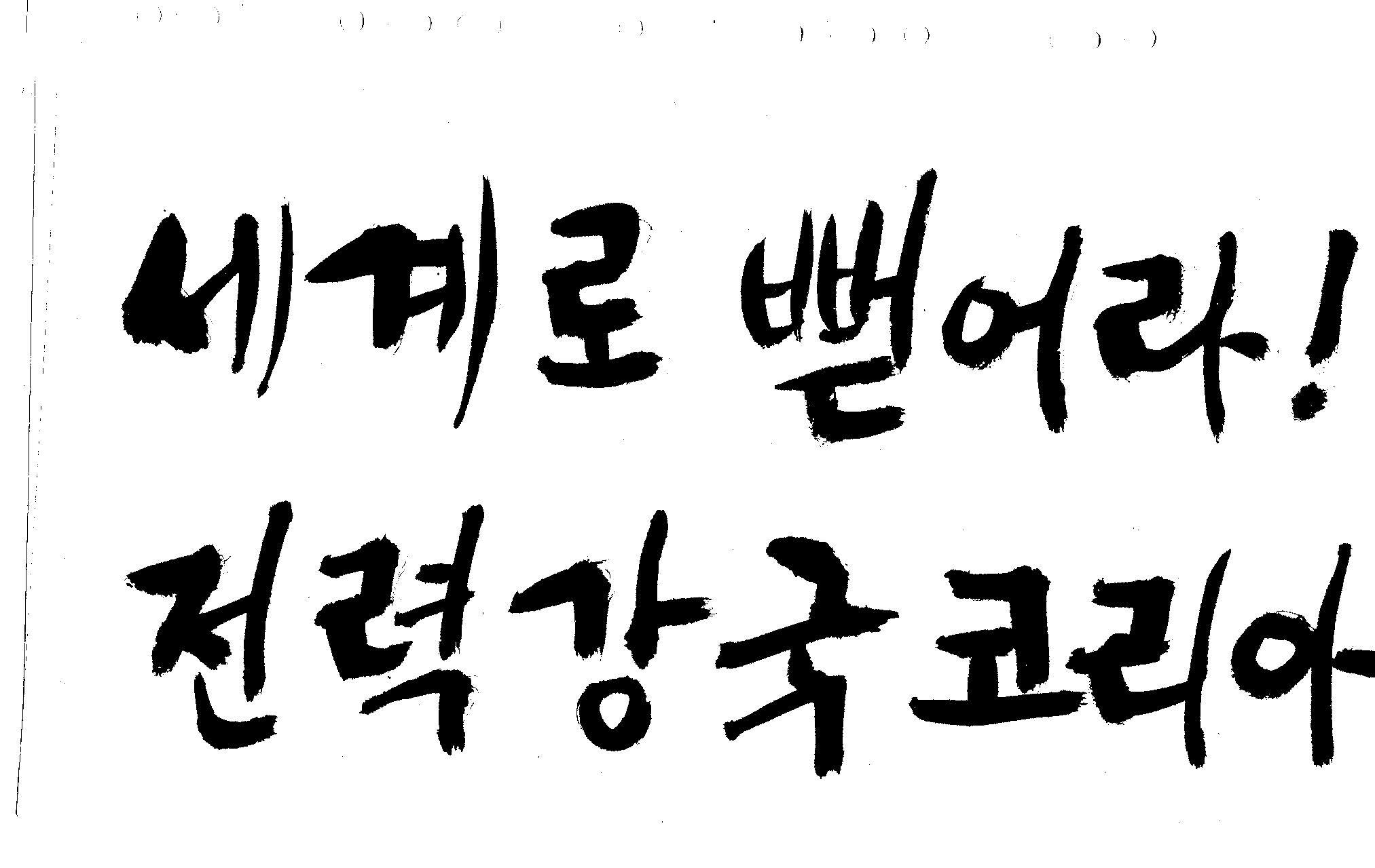 캘리 좀 부탁드려요!~ 김철호 일반 1 10555 2008.12.24 12:09 > > > > > 전력회사 신문광고를 하는데요 캘리로 멋지게 하고픈데 > > 캘리프로그램으로 아무리 써도 느낌이 안나옵니다 ㅜ.ㅜ > > 이런걸 부탁한다는 자체가 너무나도 염치없지만 부탁드립니다. > > > > 세계로 뻗어라! 전력강국 코리아 > > > 보기는 쉬워도 하기는 어려운게 > 세상 모든 일 일겁니다. > 그중에 캘리그라피가 그런것 일 겁니다... > 스캔중에 글꼴이 잘린것은 서로다른글꼴서 편집하시길... > 글수가 많아서 어쩔 수없네요... >