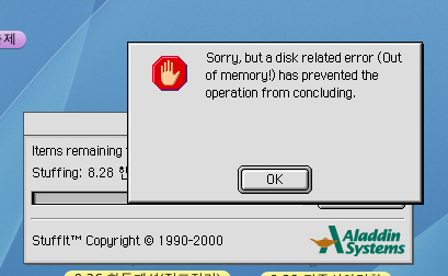 - DropStuff 응용 프로그램에 대해 사용 메모리를 좀 더 크게 잡아주세요. DropStuff 응용 프로그램을 Control키를 누른 채로 클릭하시어 정보입수를 하신 후에 사용 메모리의 숫자를 좀 더 크게 잡아주세요.